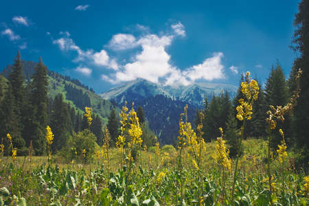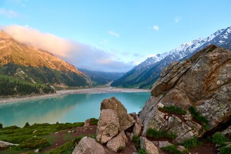 Big Almaty lake in the mountains. Green hills, flowers and fields. White clouds over the mountains. Mountain lake. In places there are stones. Protected place of nature, reserve of TRANS-ili Alatau