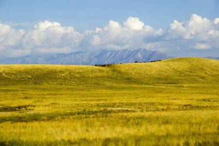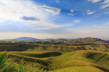 Beautiful spring and summer landscape. Lush green hills. Spring blooming herbs.