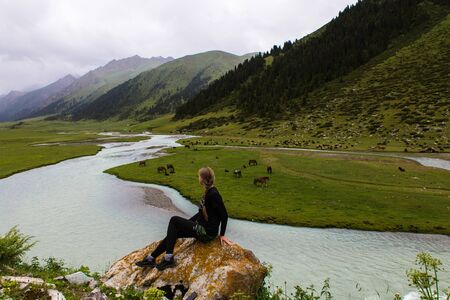 backwiev of the girl looking at Aksu river in Enilchek valley with green mountains in Kyrgyzstan
