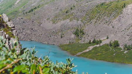 Blue lake in valley. Turquoise river in rocks. Hiking in mountains in Altai nature