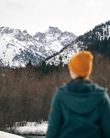 Portrait of woman in yellow hat is out of focus against epic Snowy Mountains in Kazakhstan