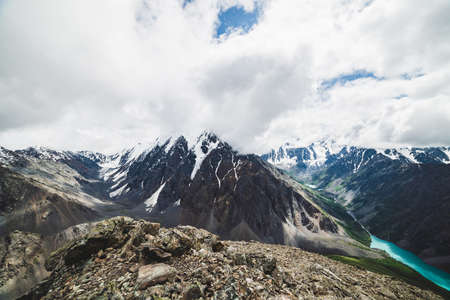 Spectacular view to scenic valley with big beautiful mountain lake surrounded by giant snowy ranges and glaciers. Amazing atmospheric highland landscape. Wonderful majestic wilderness nature scenery.