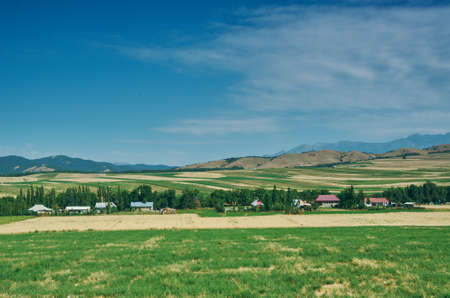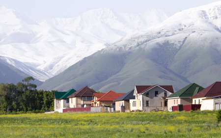 Village in Kazakhstan with Tian Shan mountains in background and small street in foreground, Kazakhstan Central Asia