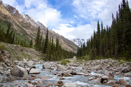 View of a mountain river between hills covered with coniferous forests against the sky with clouds. Borskaun gorge. Kyrgyzstan