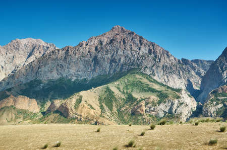 Beautiful mountain peak in the background towering over the valley. Hot meadows sparsely covered with trees. Fan Mountains in Tajikistan.