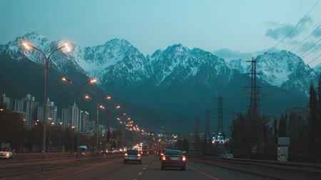 Beautiful view of road in the mountain lake Kolsai at moody evening in Kazakhstan