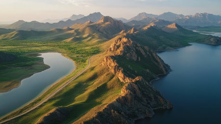 Stunning aerial view of jagged mountain range embraced by water and lush land at golden hour