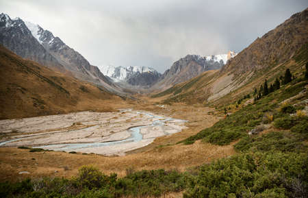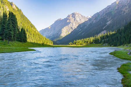 Karakol river in the mountain valley with big pine trees and snowy peak in Karakol national park, Kyrgyzstan