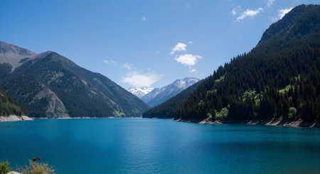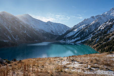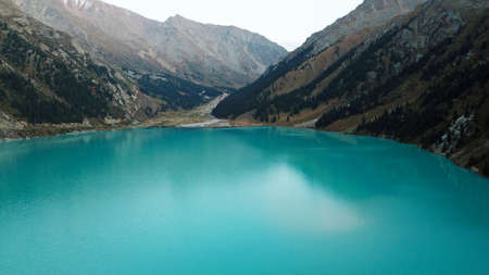 Big Almaty Lake. Blue freshwater lake. Blurred water effect. Lake with turquoise water surrounded by a mountains. Ile-Alatau National Park. Kazakhstan.