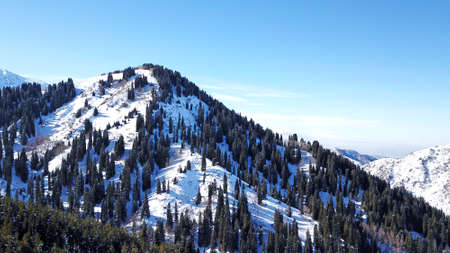 Winter forest high in the mountains. Top view from the throne of the snowy mountains and hills. Fir trees and trees grow on the hills. Some trees are covered with snow. The shadow of the trees.