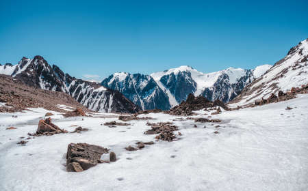 Beautiful view of the hills with a dirt road to the snowy peaks. Colorful mountain valley with rocks.