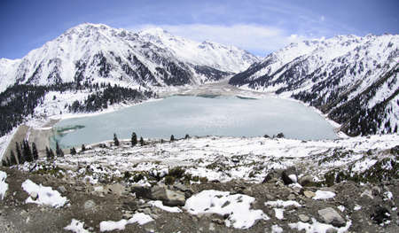 Charvak mountain lake in Uzbekistan on a snowy frosty day, surrounded by the Tien Shan mountains