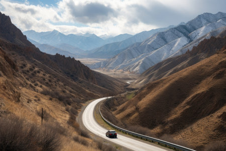 road trip adventure on a two-lane highway through the mountains, with breathtaking views and adventures around every corner, created with generative ai
