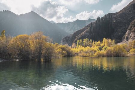 Beautiful autumn landscape. Mountains and lake, yellow trees in the reflection. Almaty, Kazakhstan.