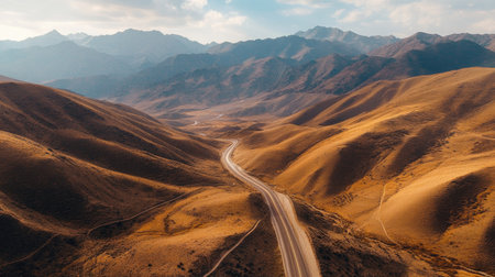 Aerial perspective of a long road leading through a mountain range with varying elevations. Perfect for journey and travel themes