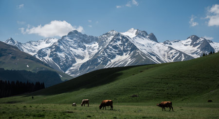 Grazing cows in the high alpine meadows of the Caucasus mountains