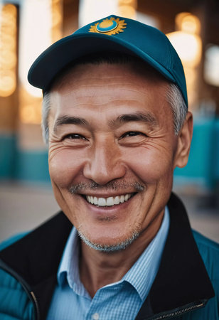 A man 50 years old with a genuine smile stands outside in a lively area showcasing a friendly demeanor and enjoying the beautiful day among vibrant surroundings. A resident of Kazakhstan. AI generate.