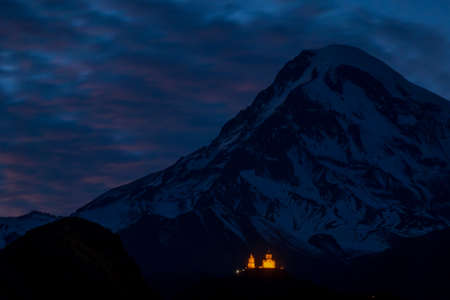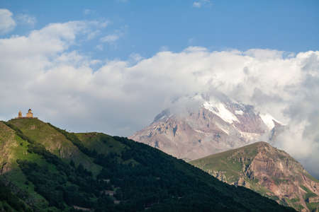 Scenic close up view of Kazbek mountain and Gergeti Trinity Church in Georgia at sunrise in summer