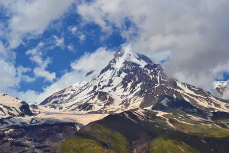 Beautiful imposing Kazbek mountain covered with glacier, Georgia. Sunny day, blue sky with white clouds.
