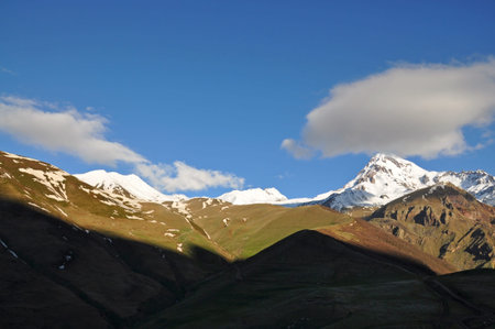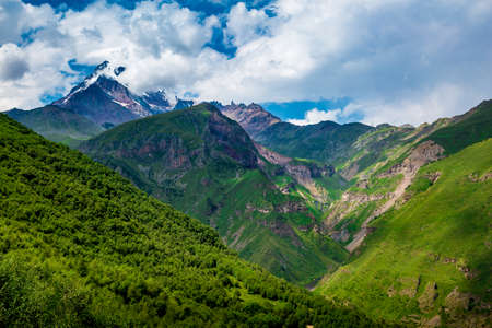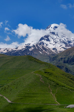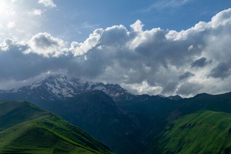 Landscape mountain view peaks in snow and green hills, deep blue sky and huge white clouds background, Caucasian mountains, Kazbek mountain, Georgia
