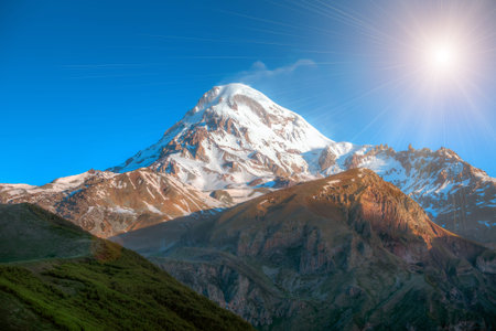 Mount Kazbegi in the setting sun. Caucasian mountains of Georgia. Summer. Evening.