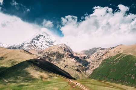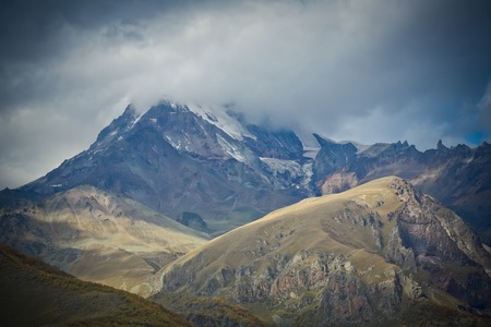 Mount Kazbek or Mount Kazbegi - dormant stratovolcano and one of the major mountains of the Caucasus mountain range. Mount Kazbek - highest mountain in Eastern Georgia