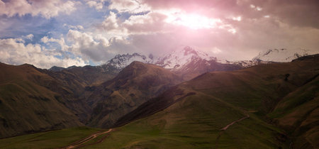 Amazing view of Kazbek mount on a sunrise panoramic view