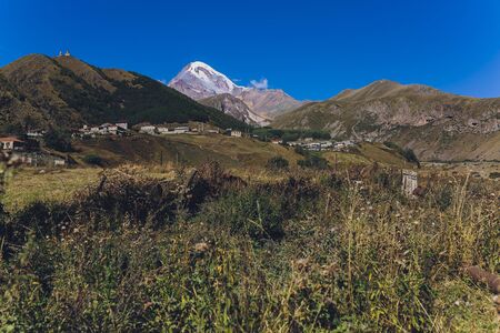 Mount Kazbek and the city of Stepantsminda in Georgia. Place for text
