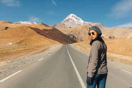 Asian tourist woman walking on the road through the mountains in concept of seeking adventure.