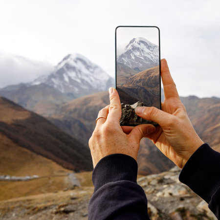 Hiker holding smartphone in mountain landscape for communication and leisure activity.