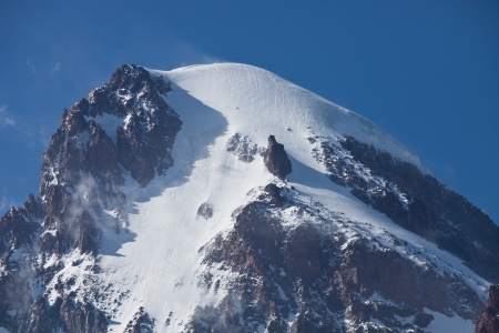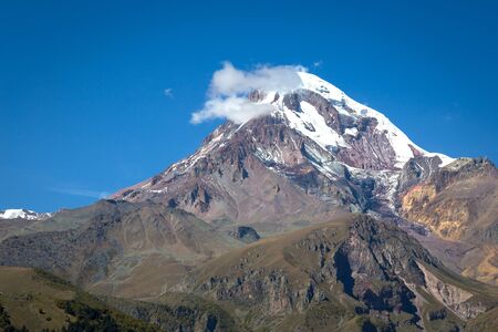 Caucasian mountains. A view of snow-covered summit of Mount Kazbegi, Georgia