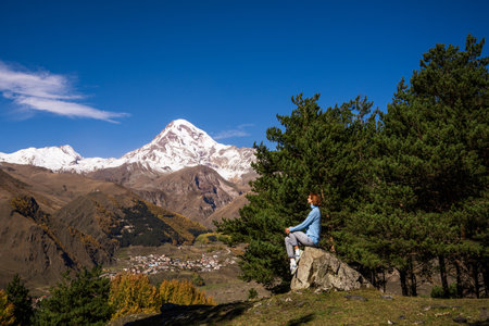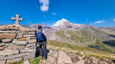 A man leaning agains a stony pillar and enjoying the view on a cloudless view on Mount Kazbeg in Caucasus, Georgia. There are lush pastures and green hills below the snow-capped peak of the glacier.