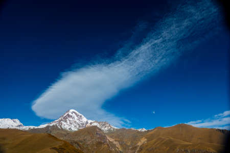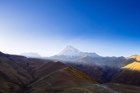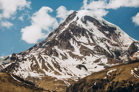 Beautiful sunny view of snowy Mount Kazbegi at autum time. Background of brown mountains and bright blue sky with clouds, Caucasus, Georgia