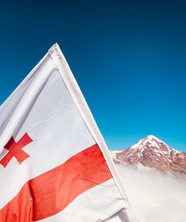 Aerial static view Angels mountain scenic viewpoint with Mount Kazbek peak background panorama. Georgian flag on hilltop Kazbegi national park. Hidden gem trail hiking trekking in Georgia