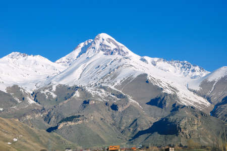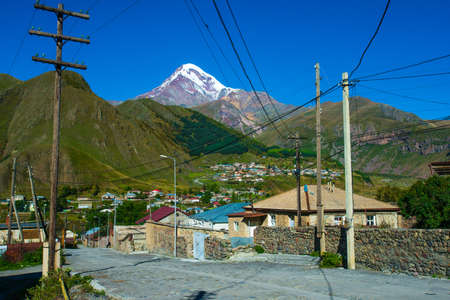Mount Kazbek (5033 meters) view from Stepantsminda town in Georgia. It is one of the major mountains of the Caucasus.