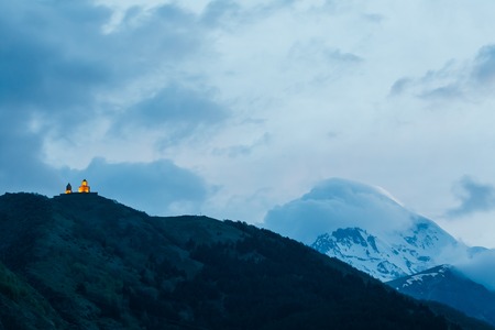 Distant view on Gergeti Trinity Church in Stepansminda, Georgia. Clear sky above the snow-capped Mount Kazbegi in the back. Sunrise, sunset