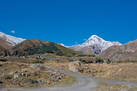 View on mountain Kazbegi, the holy mountain in the Caucasus, Georgia.
