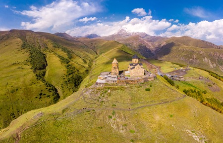 Beautiful Top view from drone to Tsminda Sameba or Holy Trinity Church Near Village Of Gergeti In Georgia and of the high mountain Kazbek, Caucasus mountains. Public place to visit.