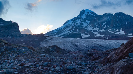 Evening landscape panorama northern prielbrusya immediately after sunset. Blue hour. Snowy volcano Elbrus. North Caucasus. Russia