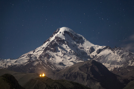 Snowcapped peak of mount Kazbek at night under a sky full of stars with Gergeti Trinity church at Georgia.