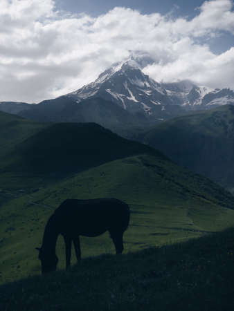 Gazing horse silhouette while on green grass hill with Kazbek 5054m mountain moody landscape near the village of Stepantsminda in Georgia.