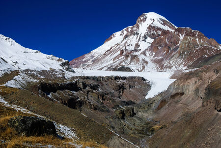 A cloudless view on Mount Kazbeg in Caucasus, Georgia. There slopes are barren and stony below the snow-capped peak and the Gergeti Glacier. Tranquillity. Natural remedy. Massive glacier foot