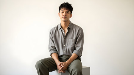 A joyful young Asian man beams with a radiant smile, showcasing his friendly demeanor against a calming blue backdrop. His relaxed posture and genuine expression evoke warmth and approachability, inviting connection and positivity.