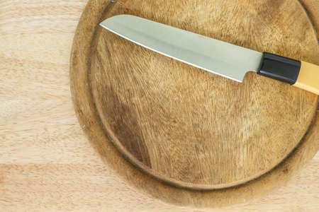 Knife on a wooden cutting board with sunlight. Selective focus.