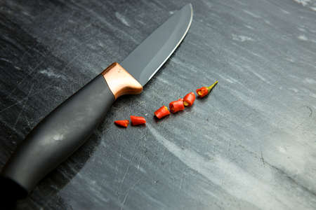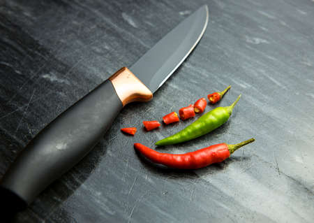 Red and green chilli peppers and one sliced chilli pepper and a knife on black background