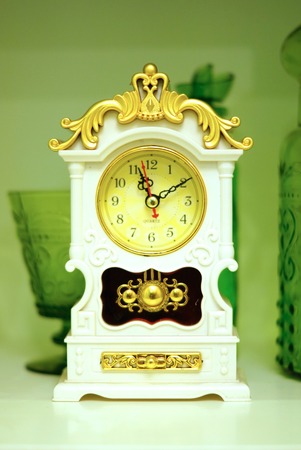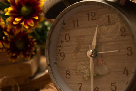 Vintage alarm clock on a shelf lit by morning sun rays. Vintage background items.