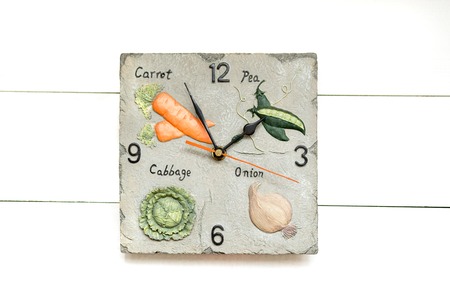 Vegetarian clock for vegetable diet, time to have dinner, white clock background.