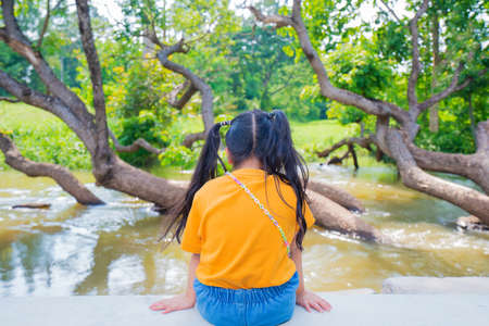 Asian child cute or kid girl sitting near the river or public park, country trip concept travel day.