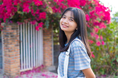 Portrait Young Asian girl outdoor, beautiful flower background.