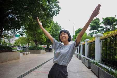 Asian woman tourist smiling traveling alone holidays outdoors on city street